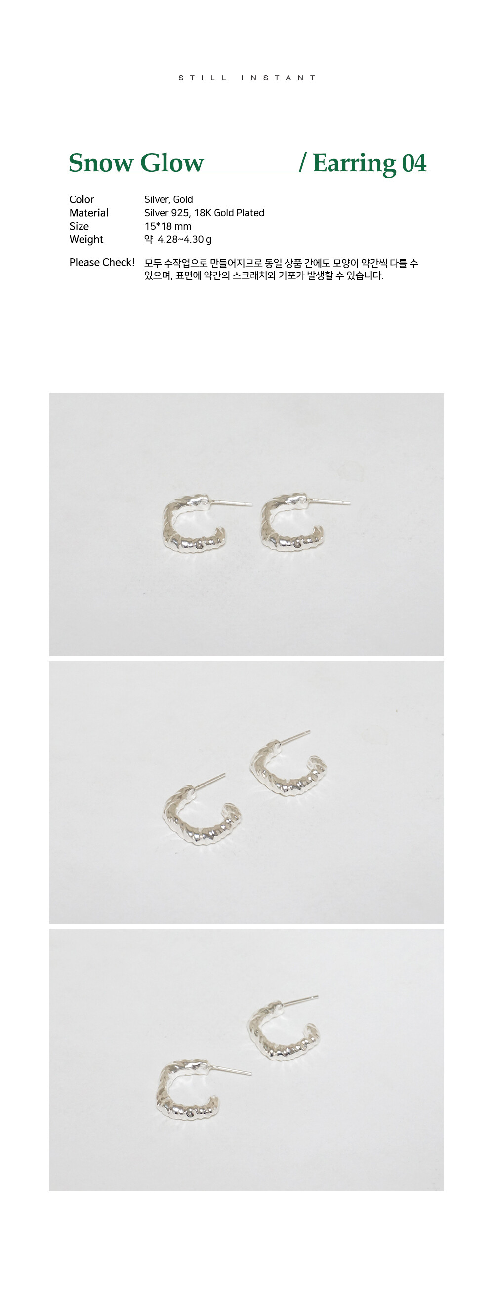 스틸 인스턴트의 주얼리는 주문 후 제작되는 핸드크래프트 제품입니다. 제작 기간은 평균 3~7일 정도 소요되며, 제품에 따라 다소 차이가 있을 수 있습니다. 정확한 일정이 궁금하신 경우, 언제든 편하게 문의해 주세요.