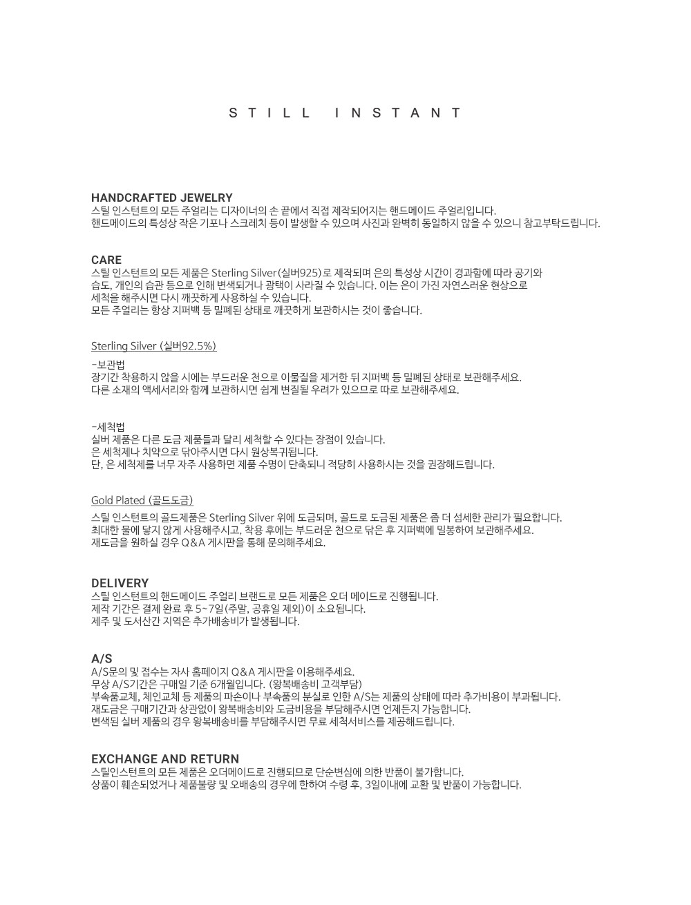 스틸 인스턴트의 주얼리는 주문 후 제작되는 핸드크래프트 제품입니다. 제작 기간은 평균 3~7일 정도 소요되며, 제품에 따라 다소 차이가 있을 수 있습니다. 정확한 일정이 궁금하신 경우, 언제든 편하게 문의해 주세요.