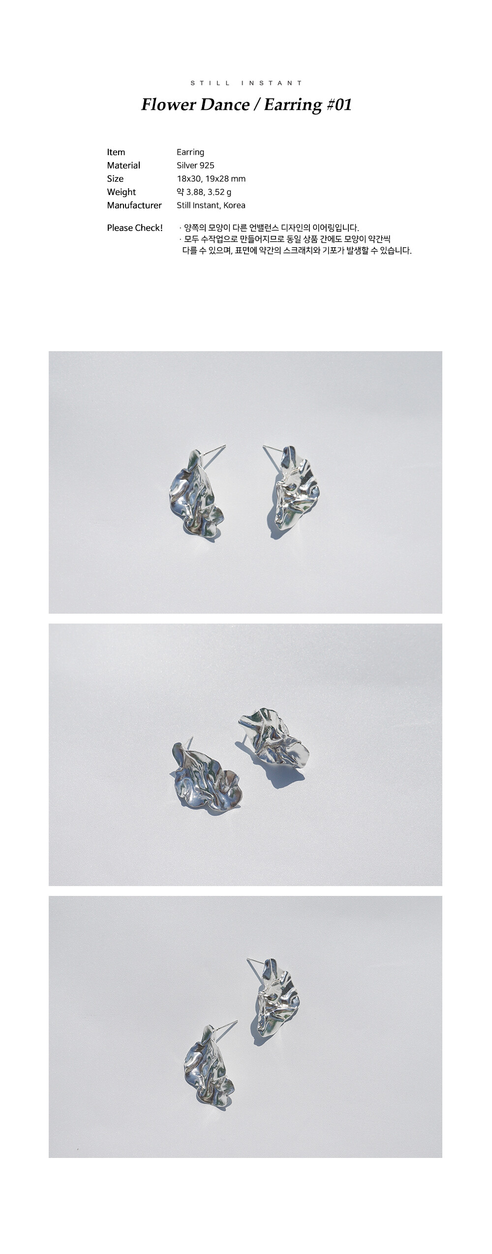 스틸 인스턴트의 주얼리는 주문 후 제작되는 핸드크래프트 제품입니다. 제작 기간은 평균 3~7일 정도 소요되며, 제품에 따라 다소 차이가 있을 수 있습니다. 정확한 일정이 궁금하신 경우, 언제든 편하게 문의해 주세요.