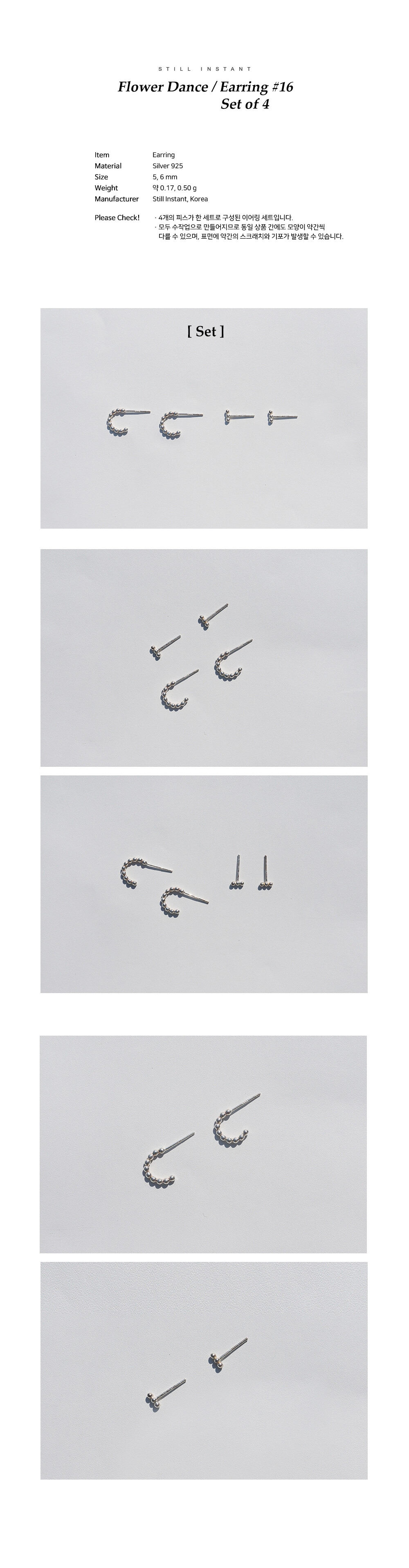 스틸 인스턴트의 주얼리는 주문 후 제작되는 핸드크래프트 제품입니다. 제작 기간은 평균 3~7일 정도 소요되며, 제품에 따라 다소 차이가 있을 수 있습니다. 정확한 일정이 궁금하신 경우, 언제든 편하게 문의해 주세요.