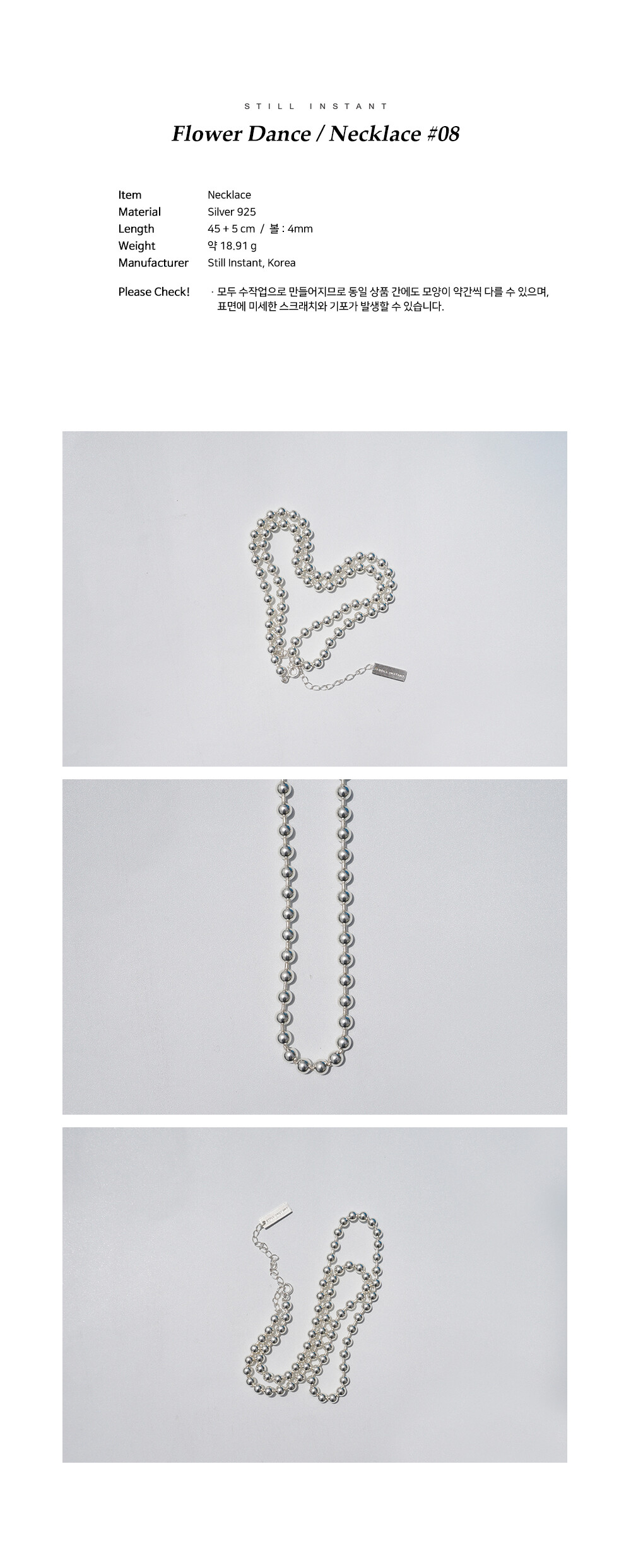 스틸 인스턴트의 주얼리는 주문 후 제작되는 핸드크래프트 제품입니다. 제작 기간은 평균 3~7일 정도 소요되며, 제품에 따라 다소 차이가 있을 수 있습니다. 정확한 일정이 궁금하신 경우, 언제든 편하게 문의해 주세요.