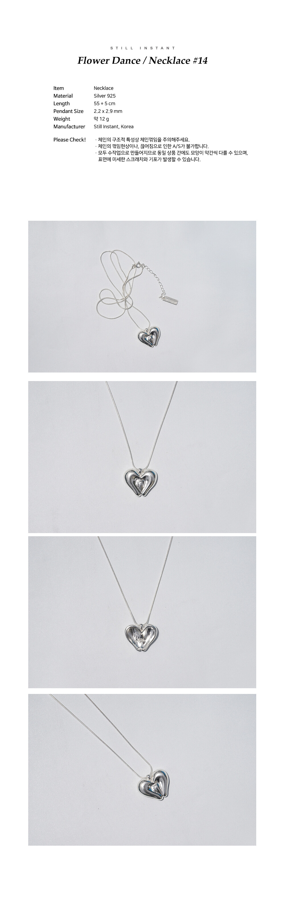 스틸 인스턴트의 주얼리는 주문 후 제작되는 핸드크래프트 제품입니다. 제작 기간은 평균 3~7일 정도 소요되며, 제품에 따라 다소 차이가 있을 수 있습니다. 정확한 일정이 궁금하신 경우, 언제든 편하게 문의해 주세요.