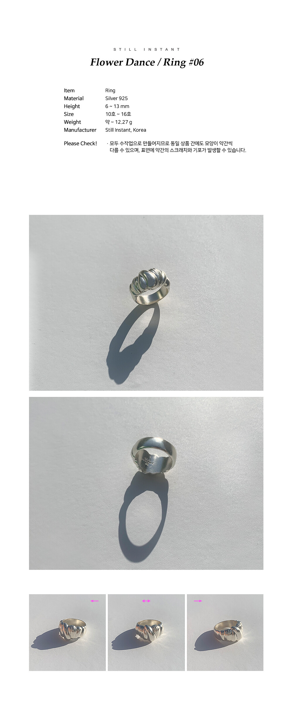 스틸 인스턴트의 주얼리는 주문 후 제작되는 핸드크래프트 제품입니다. 제작 기간은 평균 3~7일 정도 소요되며, 제품에 따라 다소 차이가 있을 수 있습니다. 정확한 일정이 궁금하신 경우, 언제든 편하게 문의해 주세요.