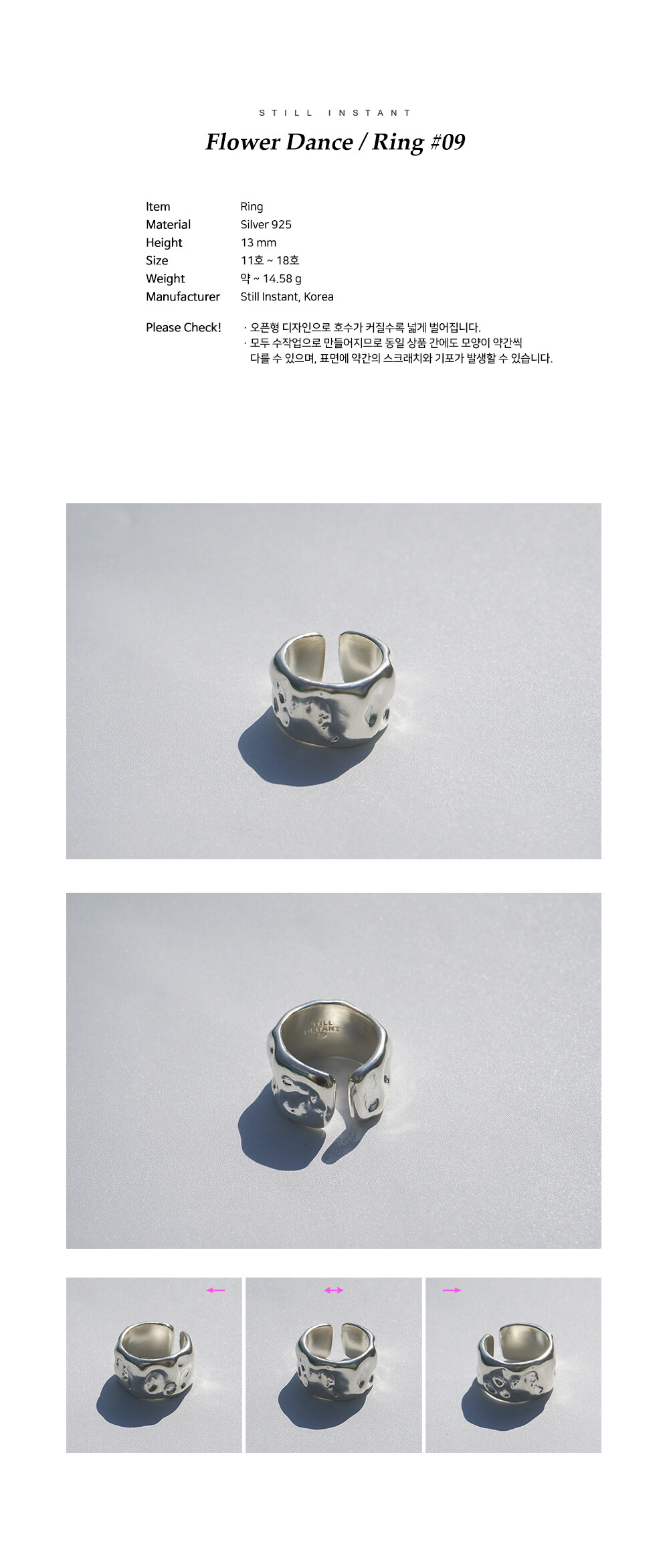 스틸 인스턴트의 주얼리는 주문 후 제작되는 핸드크래프트 제품입니다. 제작 기간은 평균 3~7일 정도 소요되며, 제품에 따라 다소 차이가 있을 수 있습니다. 정확한 일정이 궁금하신 경우, 언제든 편하게 문의해 주세요.