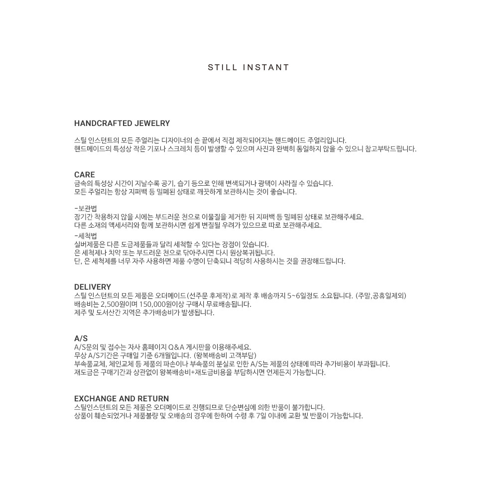 스틸 인스턴트의 주얼리는 주문 후 제작되는 핸드크래프트 제품입니다. 제작 기간은 평균 3~7일 정도 소요되며, 제품에 따라 다소 차이가 있을 수 있습니다. 정확한 일정이 궁금하신 경우, 언제든 편하게 문의해 주세요.