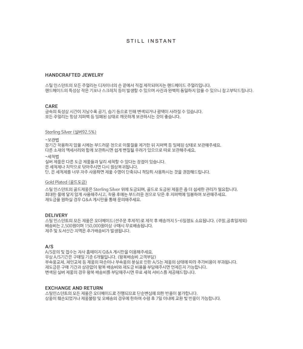 스틸 인스턴트의 주얼리는 주문 후 제작되는 핸드크래프트 제품입니다. 제작 기간은 평균 3~7일 정도 소요되며, 제품에 따라 다소 차이가 있을 수 있습니다. 정확한 일정이 궁금하신 경우, 언제든 편하게 문의해 주세요.