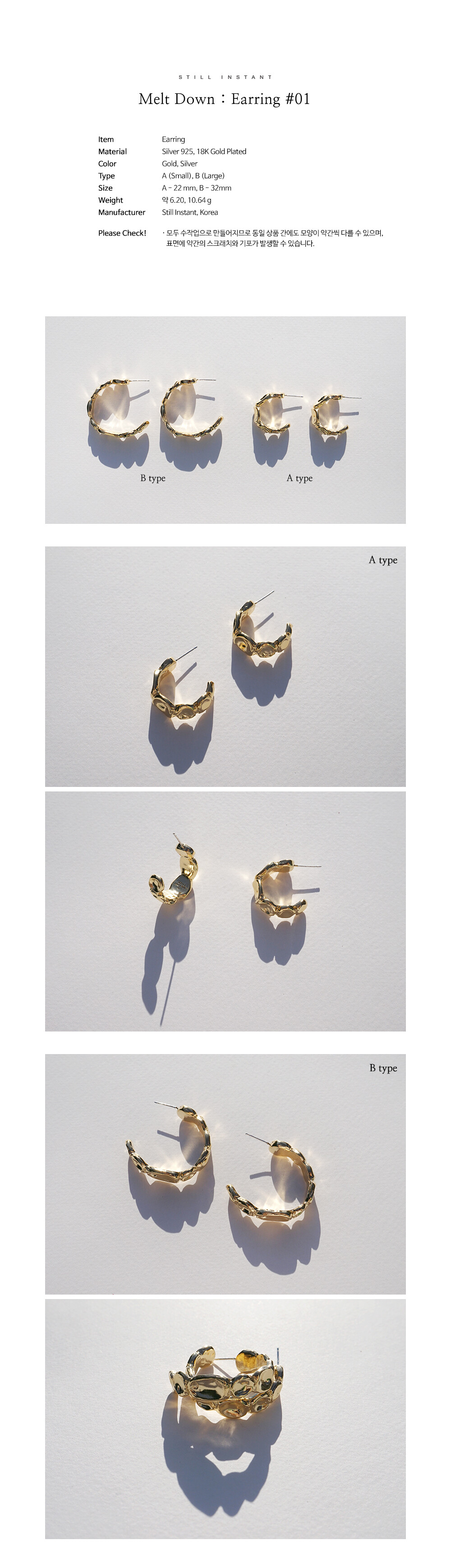 스틸 인스턴트의 주얼리는 주문 후 제작되는 핸드크래프트 제품입니다. 제작 기간은 평균 3~7일 정도 소요되며, 제품에 따라 다소 차이가 있을 수 있습니다. 정확한 일정이 궁금하신 경우, 언제든 편하게 문의해 주세요.