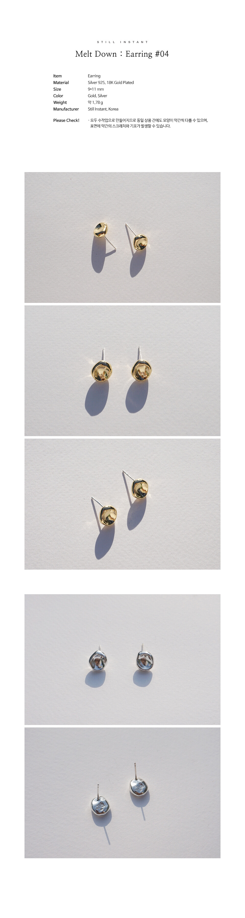 스틸 인스턴트의 주얼리는 주문 후 제작되는 핸드크래프트 제품입니다. 제작 기간은 평균 3~7일 정도 소요되며, 제품에 따라 다소 차이가 있을 수 있습니다. 정확한 일정이 궁금하신 경우, 언제든 편하게 문의해 주세요.