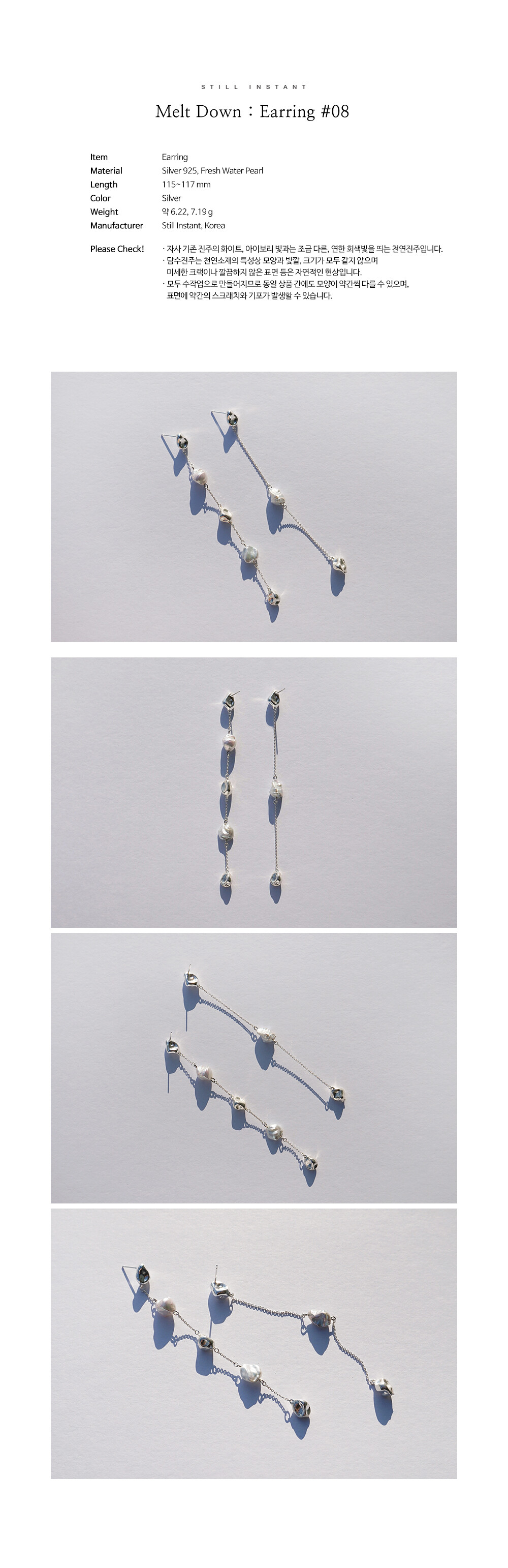 스틸 인스턴트의 주얼리는 주문 후 제작되는 핸드크래프트 제품입니다. 제작 기간은 평균 3~7일 정도 소요되며, 제품에 따라 다소 차이가 있을 수 있습니다. 정확한 일정이 궁금하신 경우, 언제든 편하게 문의해 주세요.