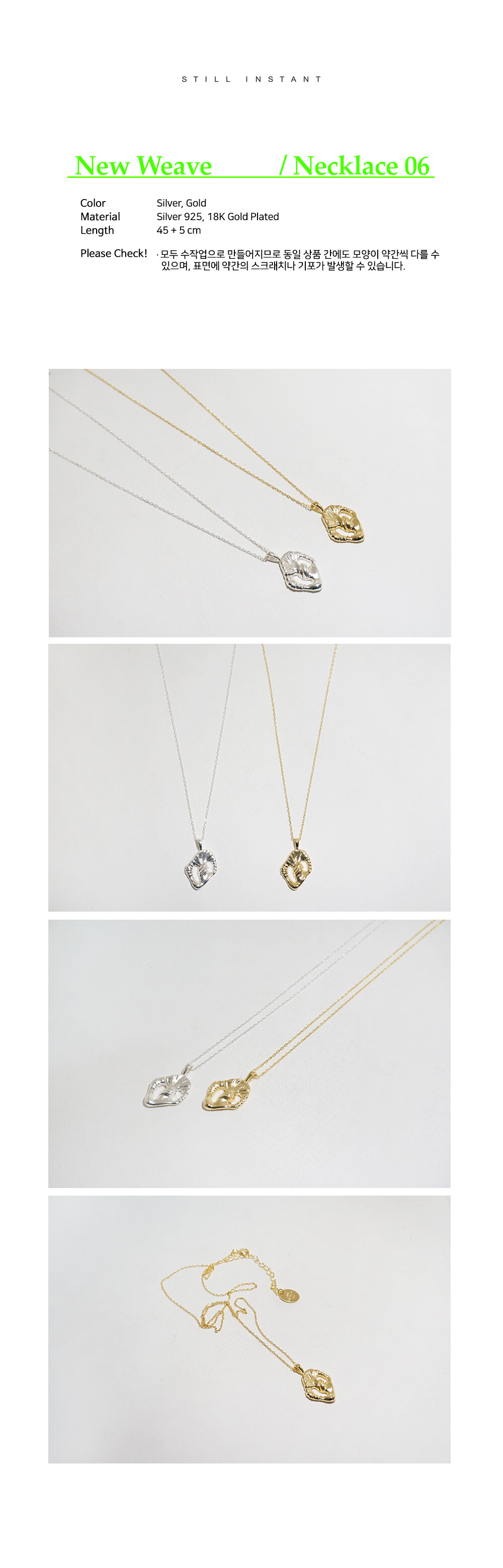 스틸 인스턴트의 주얼리는 주문 후 제작되는 핸드크래프트 제품입니다. 제작 기간은 평균 3~7일 정도 소요되며, 제품에 따라 다소 차이가 있을 수 있습니다. 정확한 일정이 궁금하신 경우, 언제든 편하게 문의해 주세요.