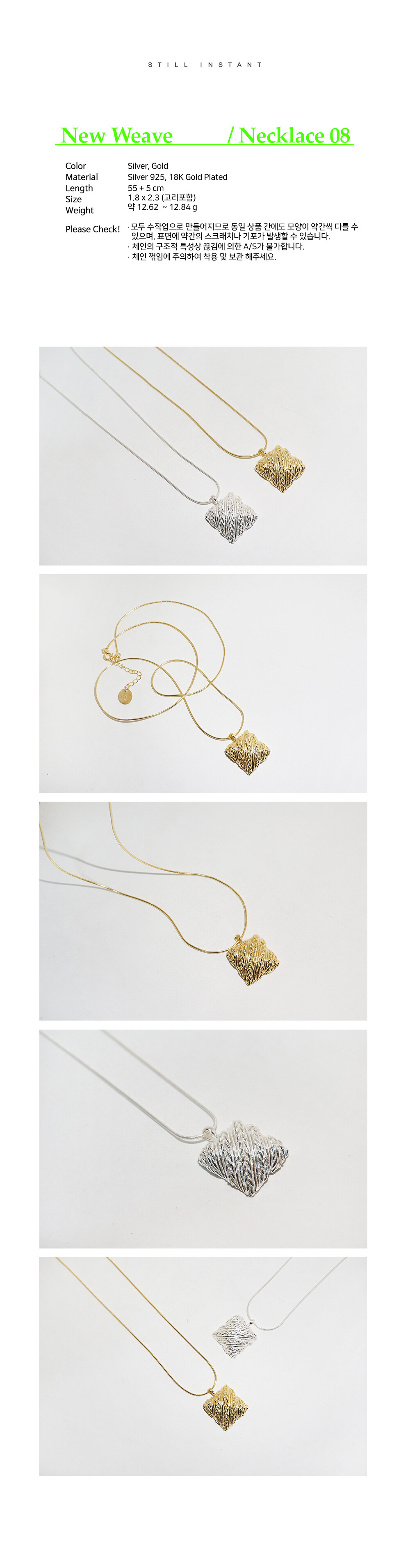 스틸 인스턴트의 주얼리는 주문 후 제작되는 핸드크래프트 제품입니다. 제작 기간은 평균 3~7일 정도 소요되며, 제품에 따라 다소 차이가 있을 수 있습니다. 정확한 일정이 궁금하신 경우, 언제든 편하게 문의해 주세요.
