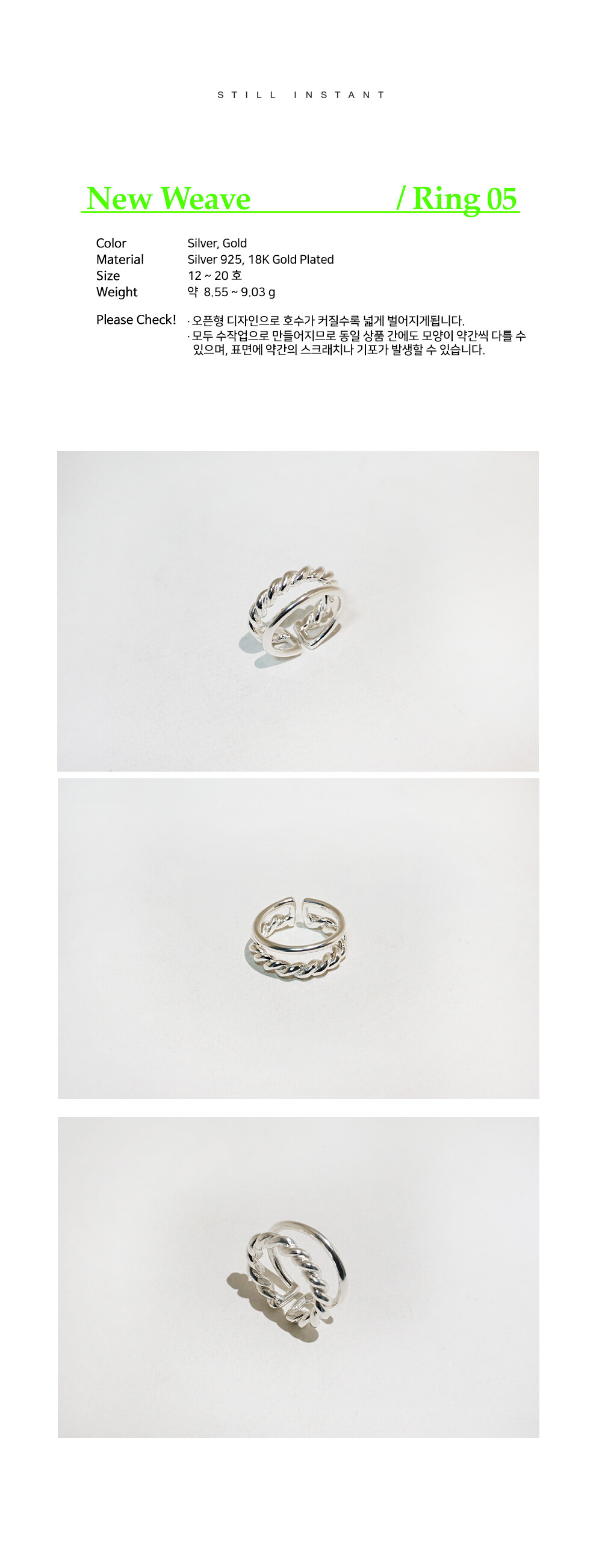 스틸 인스턴트의 주얼리는 주문 후 제작되는 핸드크래프트 제품입니다. 제작 기간은 평균 3~7일 정도 소요되며, 제품에 따라 다소 차이가 있을 수 있습니다. 정확한 일정이 궁금하신 경우, 언제든 편하게 문의해 주세요.